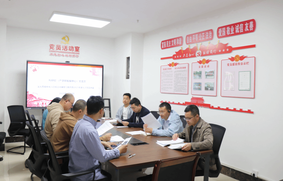 2025年4月14日,科研处(产学研发展中心)党支部在行政楼340会议室召开党支部2025年第四次党员大会暨教职工政治理论学习。会议由朱海同志主持,科研处、产学研发展中心全体职工参加会议。