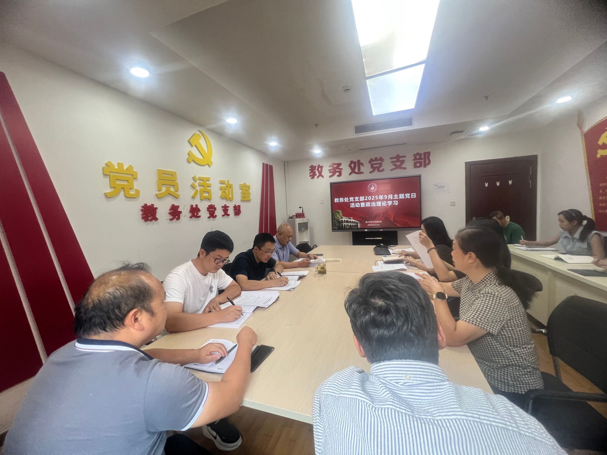 2025年9月18日下午,教务处党支部在行政楼227会议室,开展9月政治理论学习暨主题党日活动。本次活动以“持续中央八项规定精神学习教育,庆祝中国共产党成立104周年”为主题,推进部门工作作风建设常态化长效化。由教务处党支部副书记张远强主持。