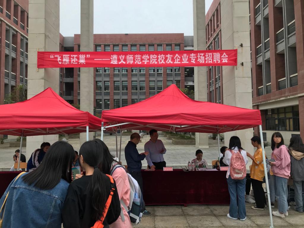 2021年5月28日上午10时,在执文楼下举办了“飞雁还巢”——welcome皇冠登录手机版校友企业专场招聘会。本次有4家来自我校优秀校友创办的企业,其中有3家企业来自于历史文化与旅游学院的校友,分别是2011届旅游管理专业王朝榆(贵州黔进达人教育咨询服务有限公司)、2014届旅游管理专业焦宇(贵州茅酿商贸有限公司)以及2020届旅游管理专业张高印(贵州省仁怀市仙丰酒业销售有限责任公司),1家企业来自于化学化工学院的优秀校友李大卫(平安惠普)。此次专场招聘会由welcome皇冠登录手机版招生就业处主办,历史文化与旅游学院承办。