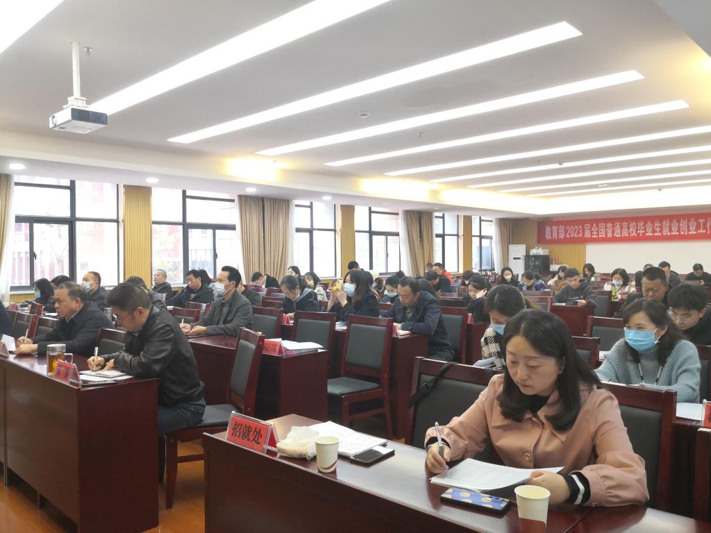 我校按照疫情防控要求,在行政楼214会议室统一组织观看视频会议。党委副书记、校长刘肇军,党委委员、副校长张鹏,招生与毕业生就业指导处班子成员及就业科工作人员、学工部、校团委相关人员及二级学院书记、副书记、学生科长、就业工作联络员、2023届毕业班辅导员、班主任参会。
