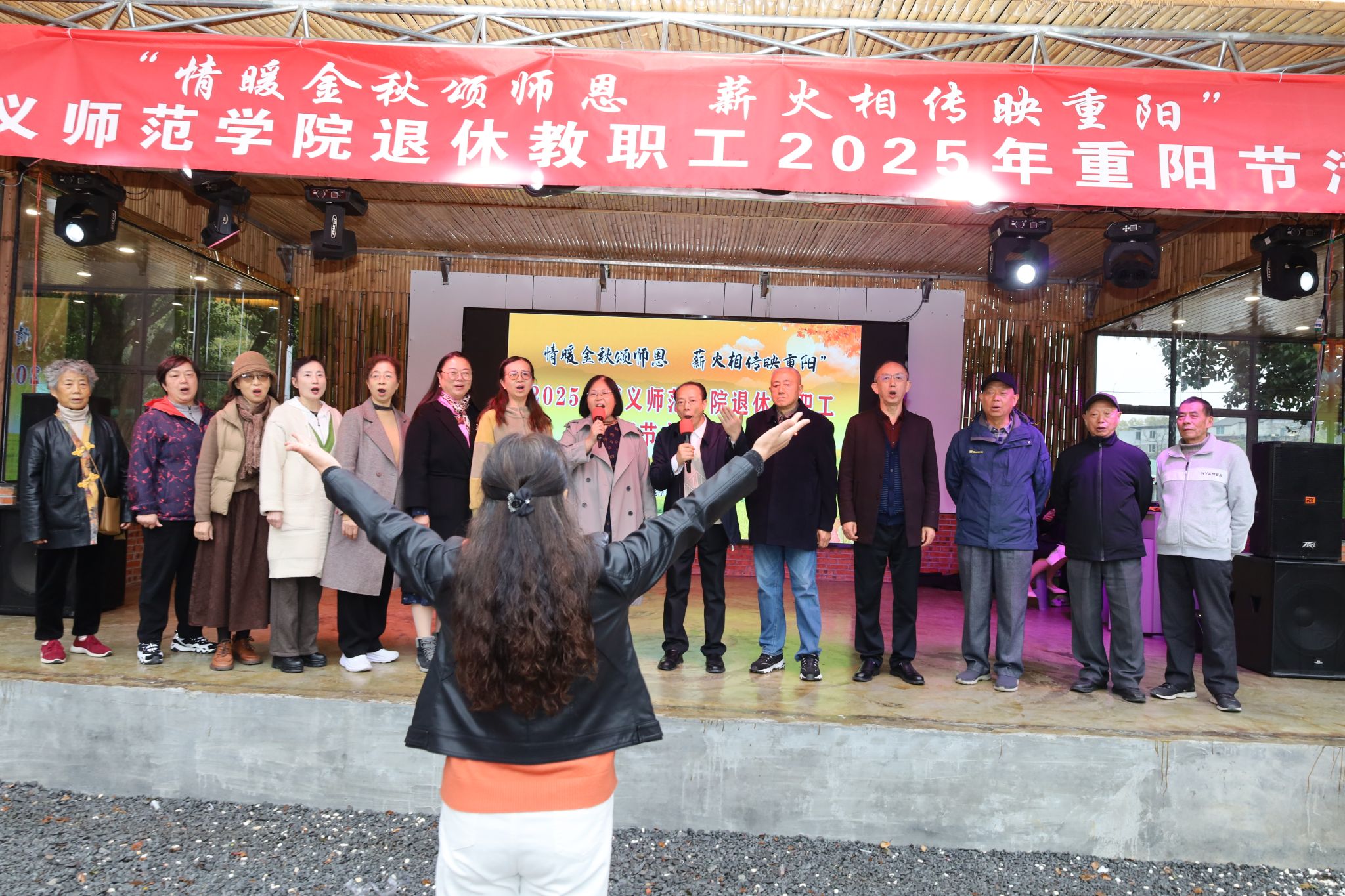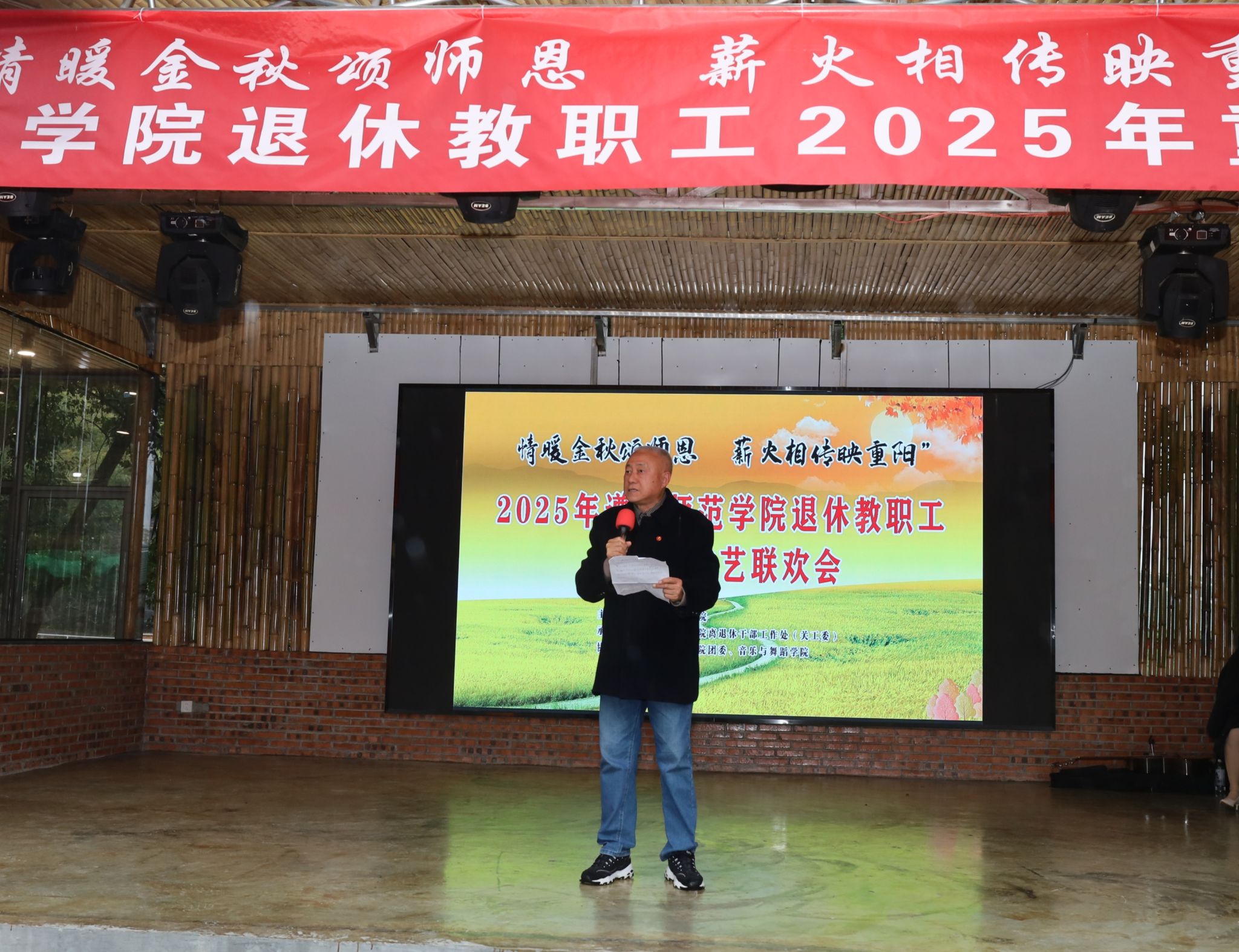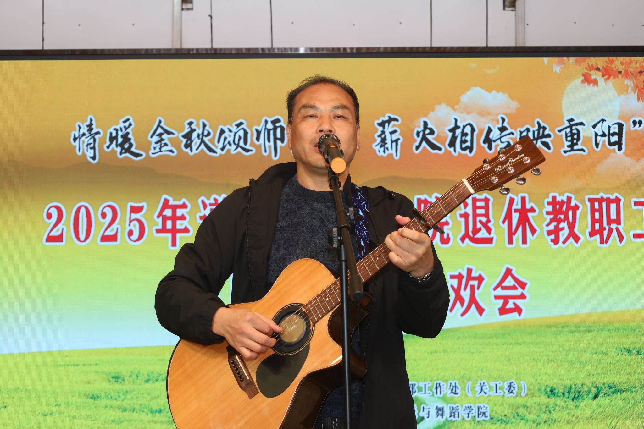 文艺演出时,精彩纷呈,高潮迭起。音乐与舞蹈学院教授班丽梅的歌曲《盛世田园》唱出国泰民安的祥和;李国士声情并茂的诗词朗诵《采桑子·重阳》《沁园春·长沙》赋予传统佳节新的时代韵味;杨远碧的电吹管独奏《祝福祖国》、李杰科的独唱《骏马奔驰跑边疆》、吴小林的吉他弹唱《风吹麦浪》、张少华的诗词朗诵《沁园春·雪》节目,充分展现了退休教职工多才多艺、积极向上的精神风貌。毕业学生、志愿者代表也纷纷献上歌舞等精彩节目,赢得了现场阵阵掌声。演出在退休第一党支部深情合唱《唱支山歌给党听》和退休第二党支部激昂高歌《祖国不会忘记》的嘹亮歌声中推向高潮,表达了老同志们对党的无限深情和对祖国建设者的崇高礼赞。
