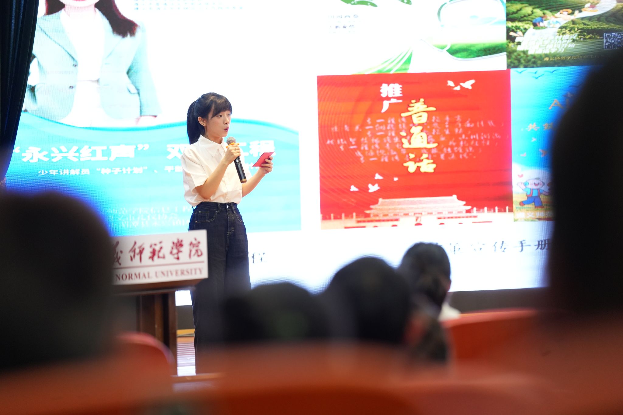 在成果展示环节,获奖实践团队代表依次呈现了暑期社会实践的丰硕成果。信息工程学院“红芯同语AI推普实践团”展示了人工智能技术在推广普通话中的创新应用,教师教育学院“知行星火实践队”分享了基础教育帮扶的实践探索,校总队“知行新思实践队”结合视频《声入乡间润民心》生动呈现了理论宣讲的创新实践,历史文化与旅游学院“同心筑梦实践队”现场作铸牢中华民族共同体意识示范宣讲。同时,协同提质计划专项团队“阡陌育见实践队”分享了参与“重走长征路·薪火永相传”专项社会实践的感悟,并通过视频《青春与坚守的对话》呈现了他们参与“汲取奋进力量”赋能教育振兴计划的成果。这些展示既体现了同学们将专业知识运用于实践的能力,也展现了遵师青年在服务基层中锤炼品格、提升素质的成长历程。