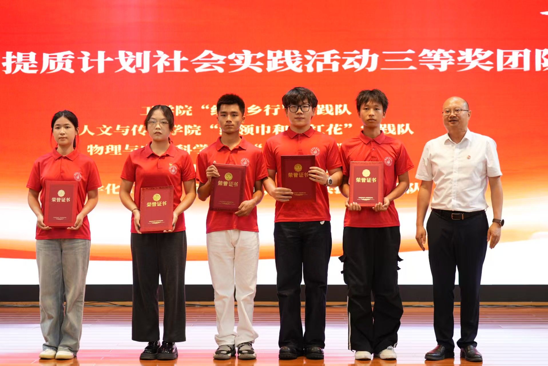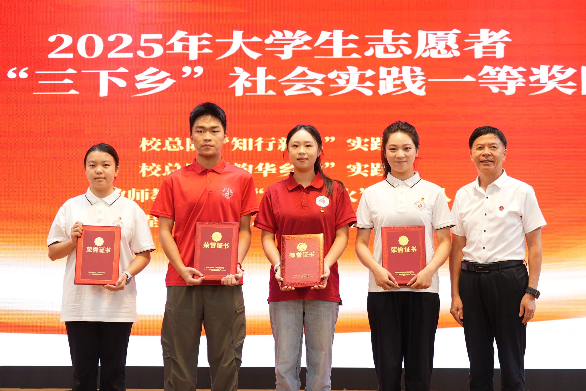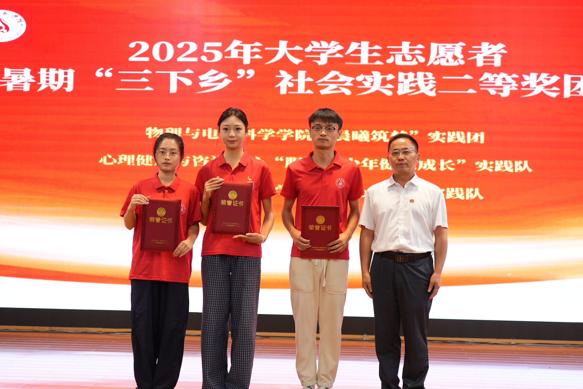 颁奖仪式上,陈治松、梁正海、周晶分别为获得2025年暑期“三下乡”社会实践活动和“重走长征路·薪火永相传”协同提质计划专项活动一、二、三等奖的团队颁奖。这些奖项既是对各实践团队辛勤付出的肯定,也是对同学们服务基层、奉献社会精神的褒奖。