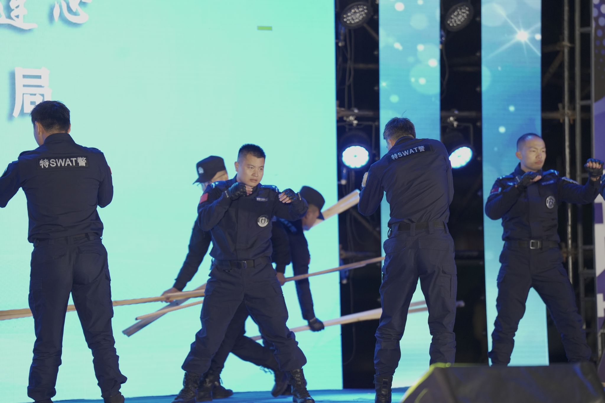 晚会高潮迭起,特警队员以雷霆之势亮相,一场力量与技巧的视觉盛宴瞬间点燃全场。他们身形稳若山岳,动作整齐划一,充满爆发力。在抱膝顶摔等高难度动作中,配合天衣无缝,倒地的控制更是分毫不差。整套拳法凌厉迅猛,招招彰显着千锤百炼的硬核风采。现场雷鸣般的掌声与喝彩一浪高过一浪。许多同学由衷赞叹:“以往隔着屏幕看就觉得很酷,今天现场看才知道有多震撼!这功底,这气场,安全感直接拉满,今天被特警小哥哥们彻底圈粉了!”