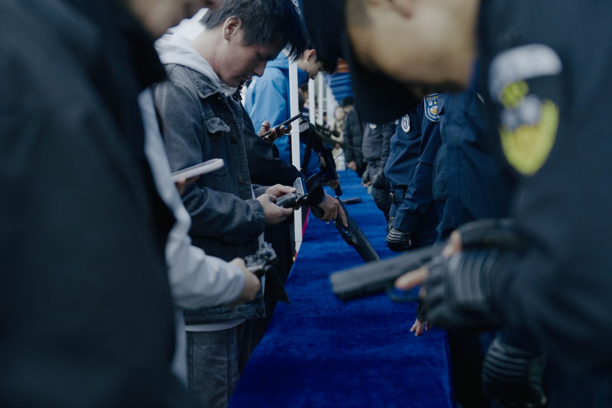 在装备展示区,现场除陈列防暴盾牌、手铐警棍外,还专门设置警用枪支展示区 ,92式手枪、防暴枪等常用警用枪械在民警看护下规范陈列。“这些枪支主要用于应急处突、震慑犯罪,每一把都有专属编号……”民警手持模型枪演示正确持握姿势,详细讲解枪支使用规范,学生跃跃欲试,在民警指导下体验防暴盾牌操作、枪支操控,师生拿出手机与各类枪支合影,直呼“安全感拉满”。