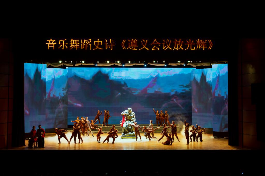 《遵义会议放光辉》是学院为纪念遵义会议召开80周年,于2015年推出的“传承红色基因、讲好遵义故事”红色经典剧目,此后多次复排演出。整台演出由序曲、第一篇章《喜迎红军》、第二篇章《遵义会议》、第三篇章《走向胜利》和第四篇章《美丽遵义》组成,以多种艺术形式,着力表现遵义人民喜迎红军、召开遵义会议、四渡赤水等重大历史事件,鲜活地再现中央红军在遵义转战三个月期间取得的辉煌战绩,体现出中央红军不怕苦不怕累的精神。